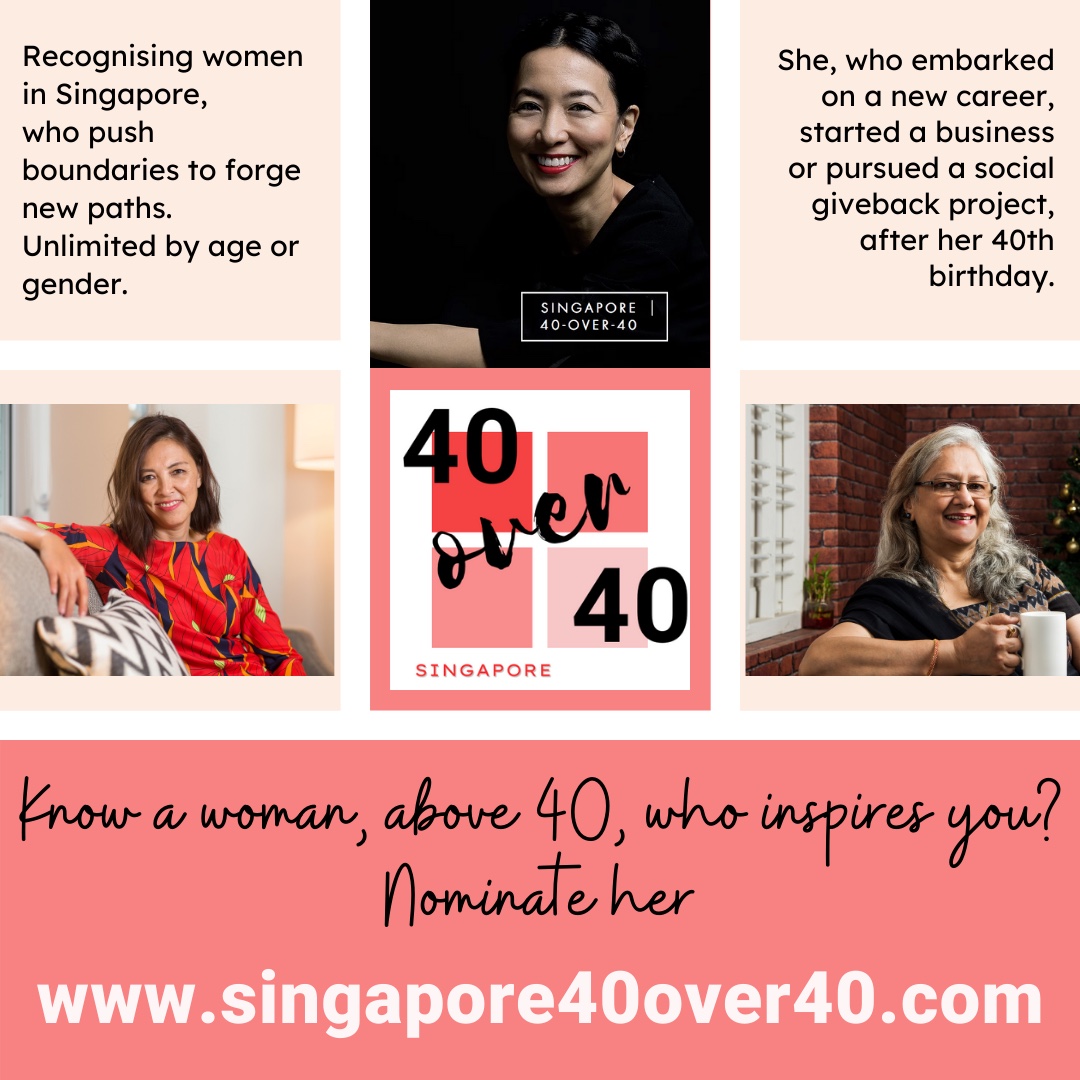 Designed to celebrate the woman who restarted a career path, embarked on a new business adventure, sought out her passions as she approached the mid-point junction of her life. Singapore: 40-over-40 aims to celebrate the female that has taken risks and faced challenges to embark on a new career, try a new path or start a business after her 40th birthday.