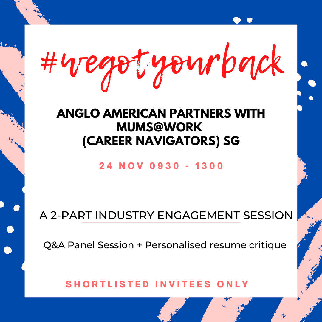We partnered Anglo American to conduct a RESUME-CRITIQUE (personalised) and INDUSTRY-ENGAGEMENT SESSION on 24 November. Thankful to corporate partners who support our mission to help women upgrade, upskill and push forward. This free-to-attend session was open to female talents, keen to have an employer give personalised critique (and improvements) to their resume, as well as interested in learning more about a career in a new industry.