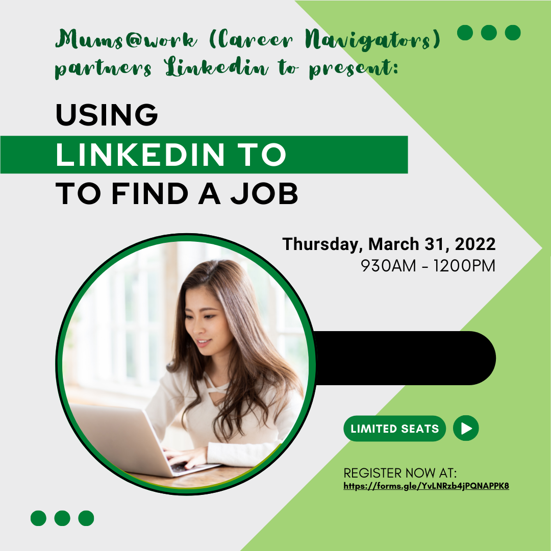 Mums@Work (Career Navigators) partners LinkedIn to present a 2-part series on USING LINKEDIN to secure a job.