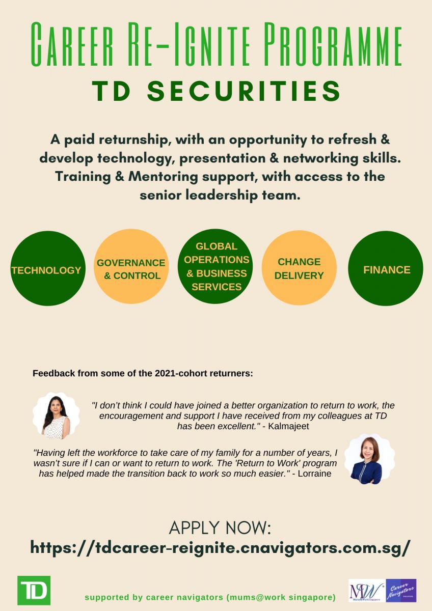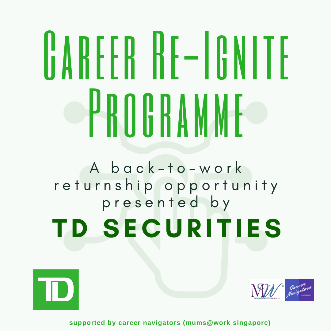 The Career Re-Ignite Programme is a RETURNSHIP offered by TD Securities to experienced professionals, who are currently on an extended career break of at least two years, and plan to relaunch their careers.
